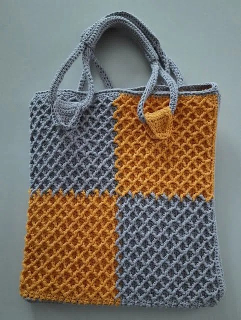 Then work the two squares together with single crochets on the inside of the bag. Turn the bag over and pull the bag into shape! Now all we have to do is attach handles to it.